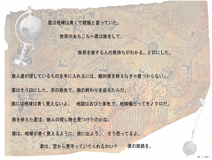 僕には地球は青く見えないよ。 地図は古びた茶色で、地球儀だってモノクロだ。